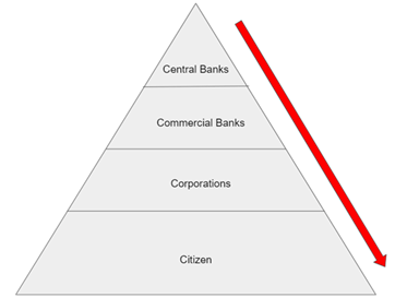 Inflation hurts everyone in the monetary ecosystem, but it especially hurts those in lower social classes. Whoever is issuing the currency sees the highest value of it (i.e. government). For inflation to be realized within an economy there is a trickle-down value effect. Central banks see the highest value of the dollar printed, while the consumer who sees it last, will witness the least value in the currency. It is something I call the Currency Value Deterioration Pyramid. This is also academically called the Cantillon Effect.