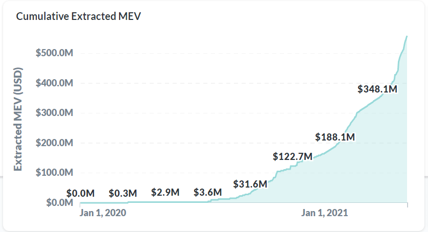 Miner Extractable Value (MEV) is value that miners/validators make by censoring users, reordering transactions, or implementing their transactions before others. Miners are not the only ones searching for MEV. MEV bots, run by traders bid up gas fees in an attempt to prioritize there transaction to extract value. 97% of the time MEV is an arbitrage opportunity. The arbitrage arises from an asset that is mispriced between two decentralized exchanges (DEX). During periods of high volatility, miners can take advantage of liquidations of collateralized loans that fail to meet Loan-to-Value requirements. Algorithmic protocols require liquidity during volatile phases and will sell at prices that differ from the spot price.